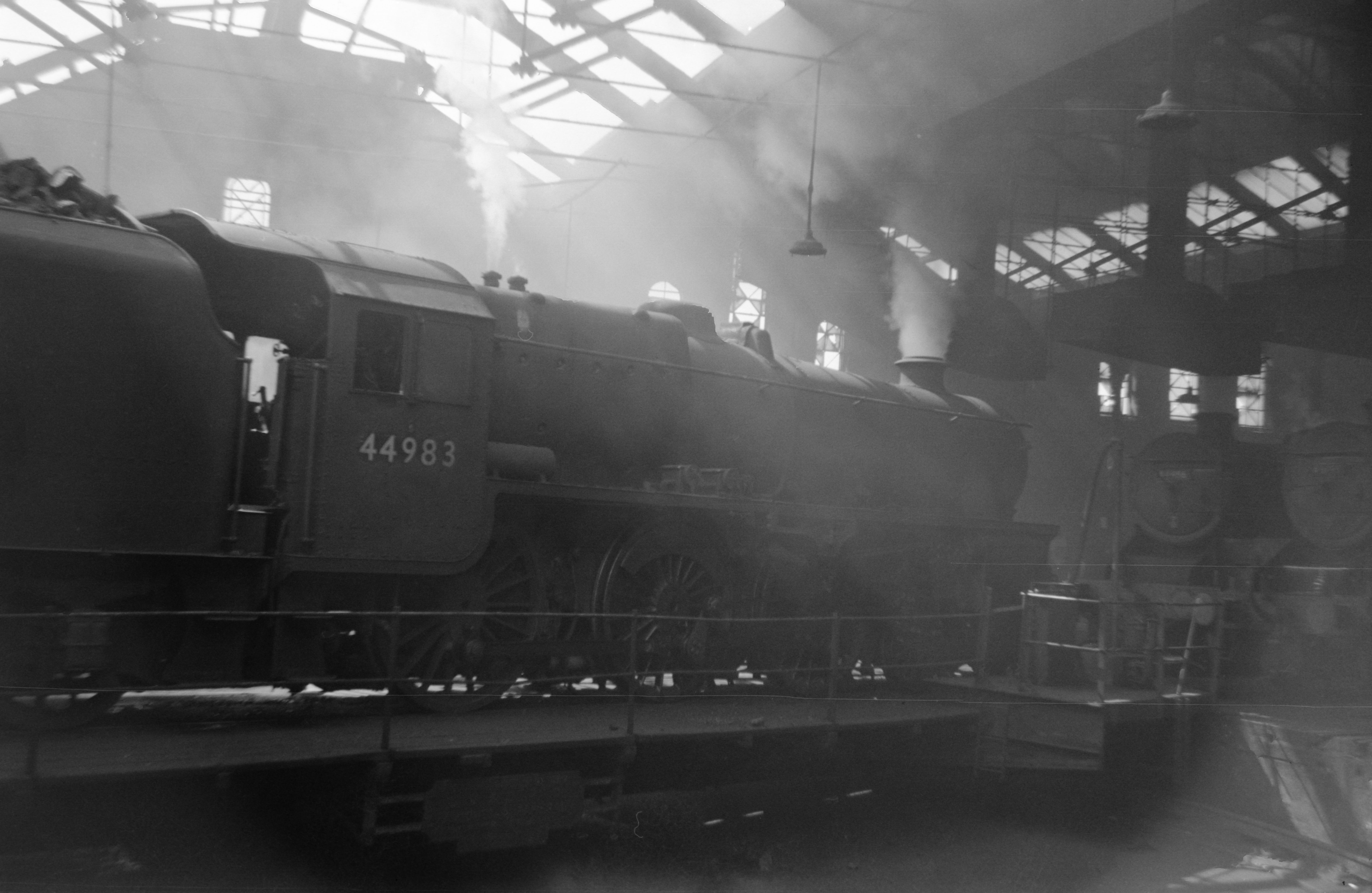 Stanier 4-6-0 5MT 44983 on turntable inside shed