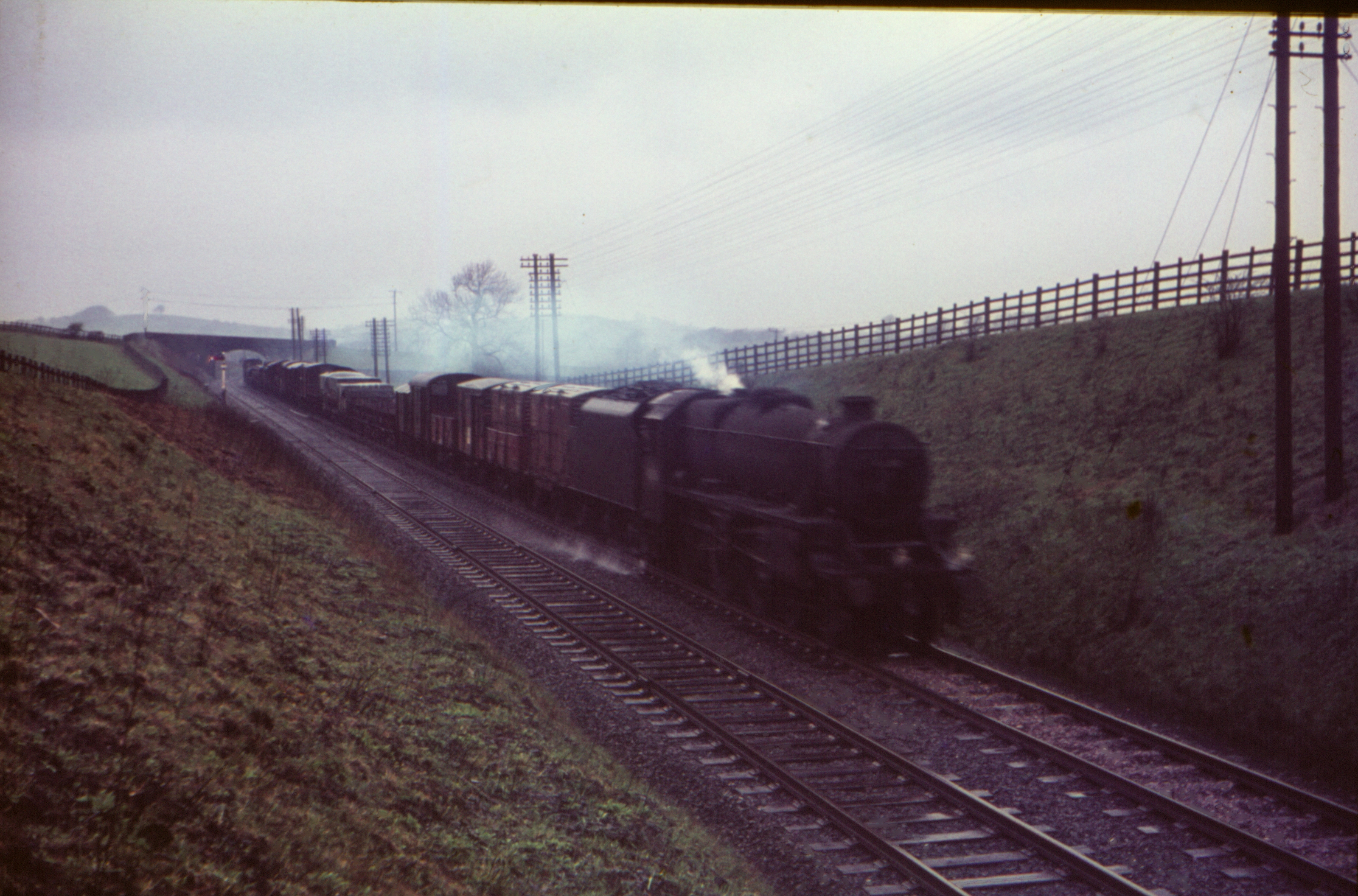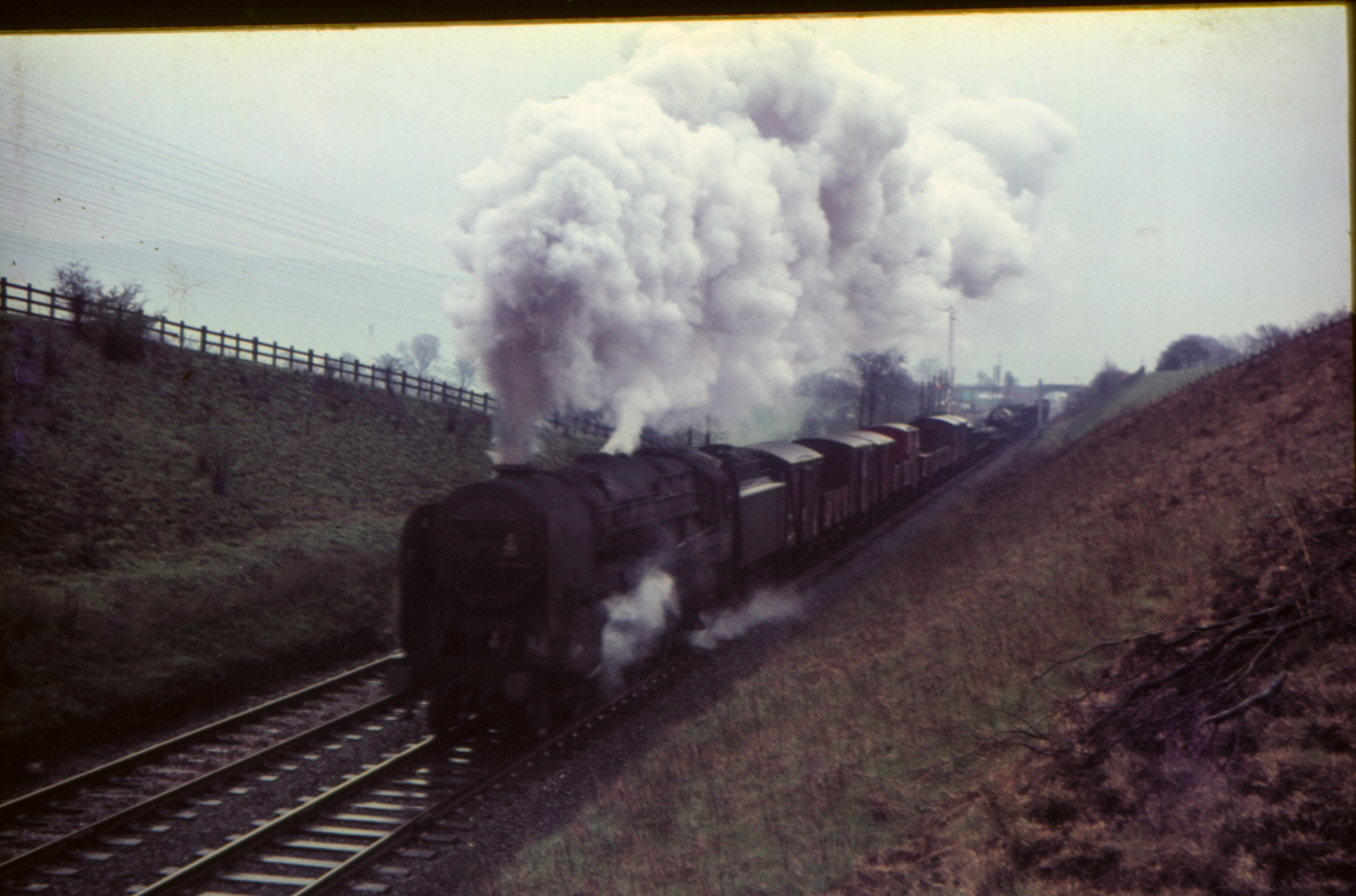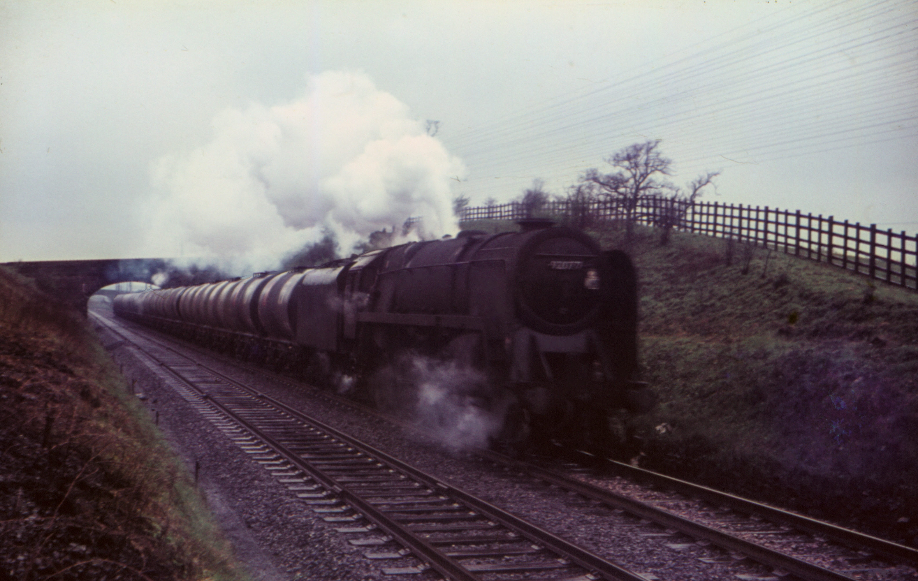 BR Standard 2-10-0 9F 92077 Approaching Gargrave with southbound oil tanks