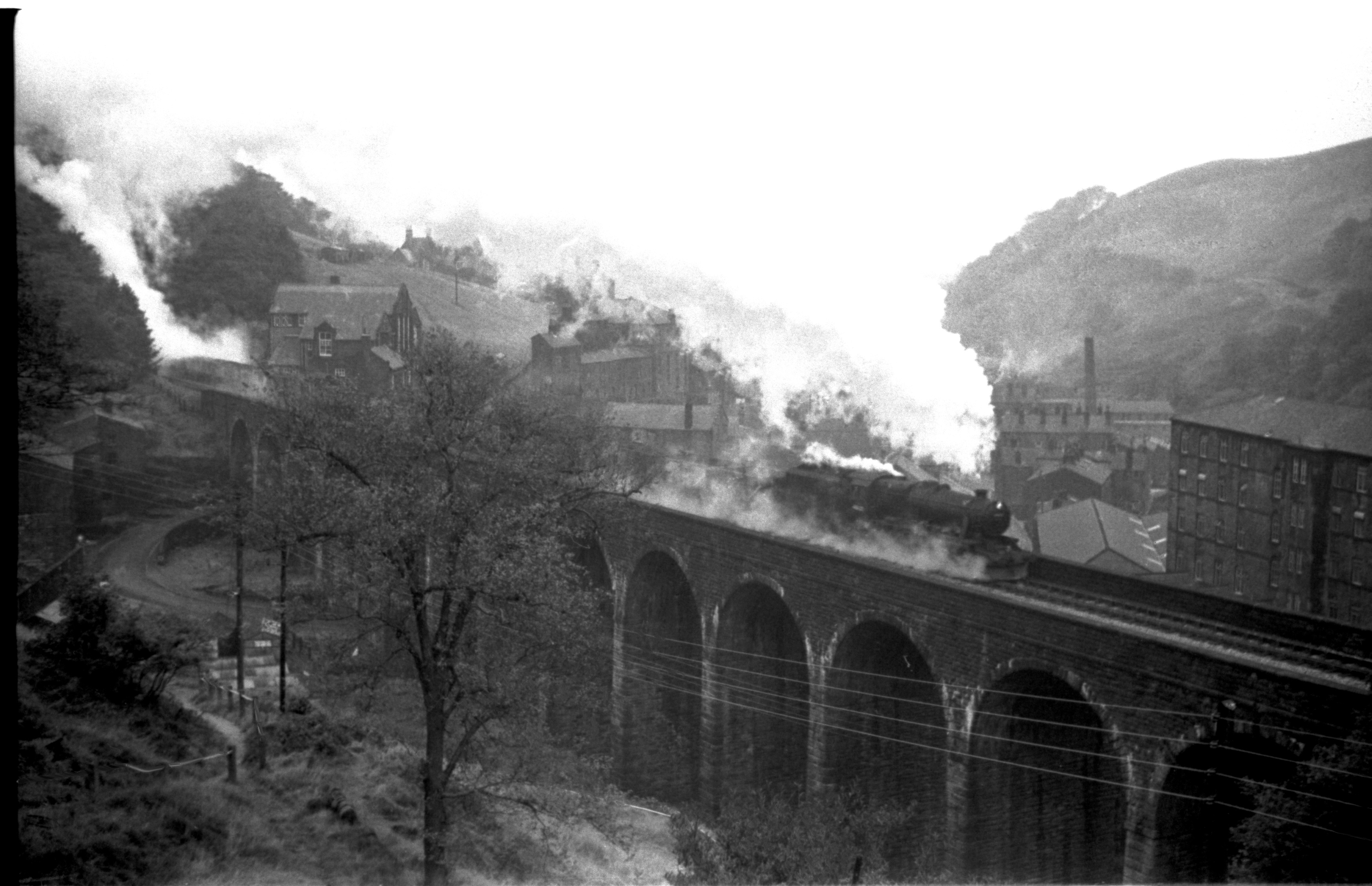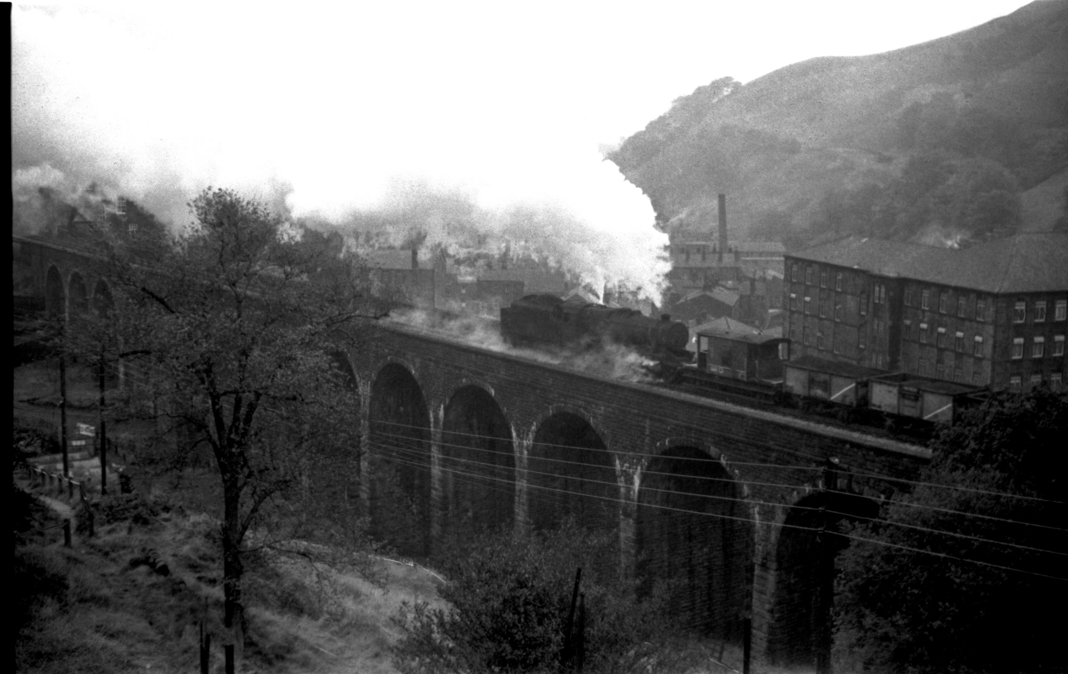 Stanier 2-8-0 8F 48622 Crossing Lydgate viaduct with northbound loaded coal for Burnley power station 8th Oct.1966