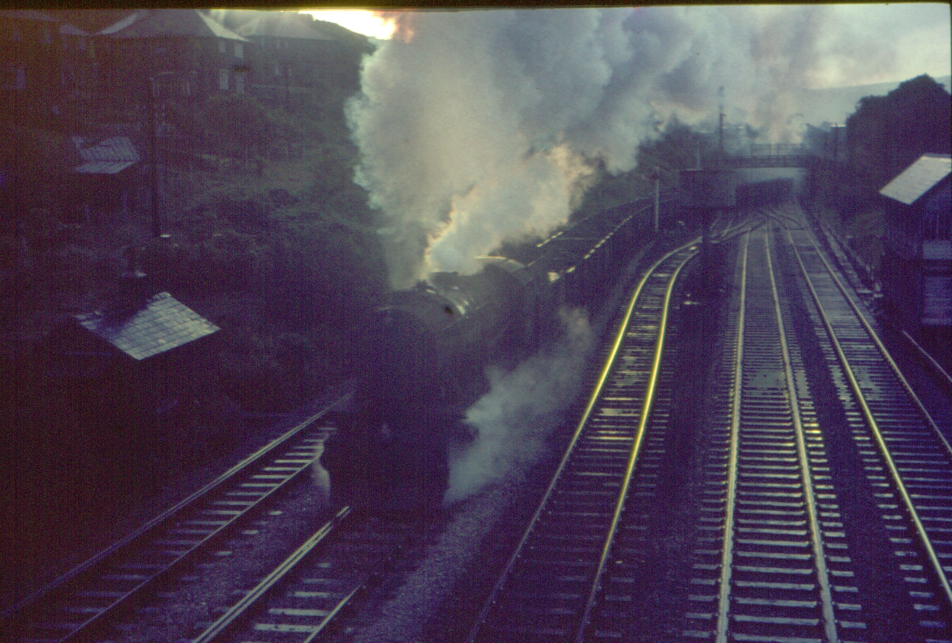 As dawn breaks WD Austerity 2-8-0 8F 90363 turns off the Calder Valley route at Hall Royd Junction Todmorden with loaded coal for Burnley power station 9th July 1966
