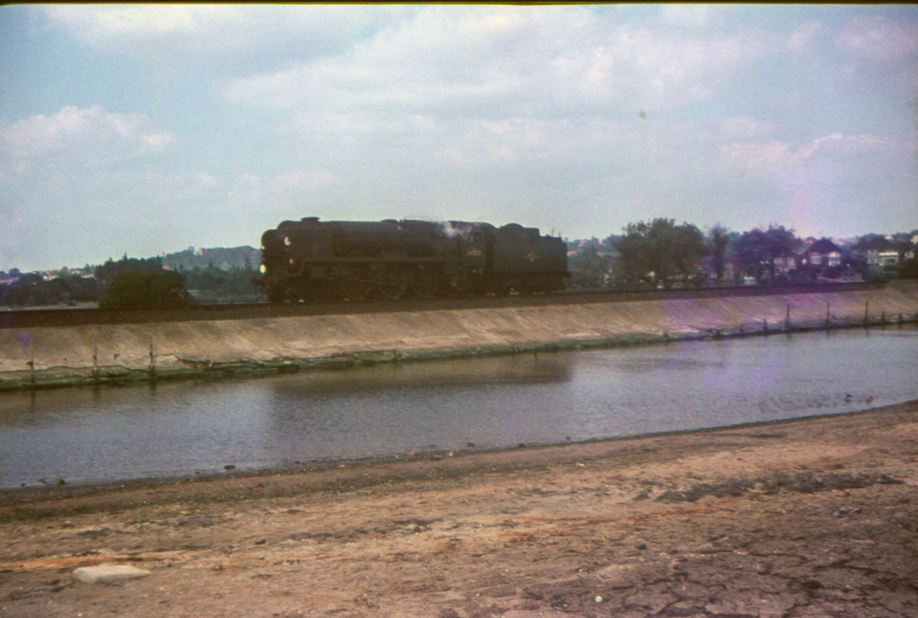 An unidentified Bulleid Merchant Navy 4-6-2 8P Approaching Holes Bay Junction near Poole with the 1308 Bournemouth Central to Weymouth