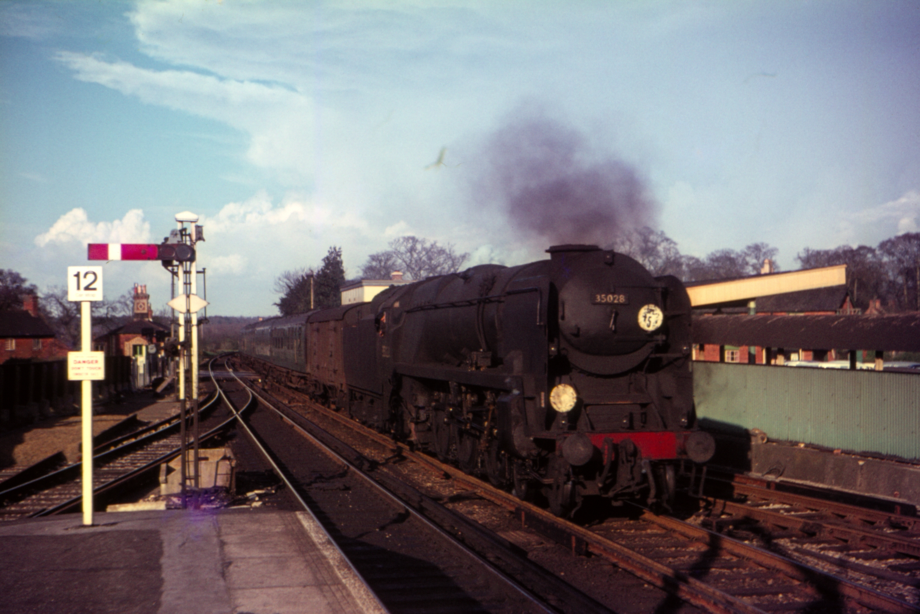 Bulleid Merchant Navy 4-6-2 8P 35028 "Clan Line" Arriving with 1530 Waterloo to Weymouth 29th March 1967